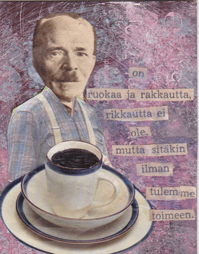 Nyt olen sitten oikeen askarrellut. Pohja pahvin (Pakastepitsan pahvi jossa tuoteselosteet)hioin ensin hiekkapaperilla sitten levitin vaaleanpunaista vesiväriä ja seuraavaksi tuputin viininpunaista leimasinmustetta sitten kuplamuovilla leimasin valkoisella leimasinmusteella ja viel piti tummanruskeella musteella painaa lääkepullonkorkilla pylpyröitä ja pohja sai kuivuu painon alla yön yli.Ihmisten päät on vanhan lehden synttärisivulta kropat on Kantri lehdestä ja kahvikuppi varmaan jostainb kuvastosta ja teksi vanhasta Nyyrikistä. Ihailen Half Way Storagen Tuiren kortteja ja näissä olen yrittänyt HUOM! siis vain yrittänyt matkia hänen tyyliään. Näitä tehdessä sain kyllä kaikenlaisia kivoja sivuideoita.Ai niin käytin näissä myös Silpputehtaan siskon ideaa käyttää kynsilakkaa, laitoin sitä sanojen päälle jotta eivät irtoa ja karkaa. Kiva idea eikä kestä kuivua niin kauan kuin erikiipperi tai servettilakka eikä kiillä niinkuin teippi varsinkin kun käytin valkoista helmiäislakkaa jota minulla sattuu olemaan muutamakin pullo.VARATTU VILIMARIKALLE